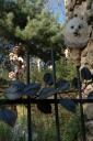 L‘arrivée au château du Pin, un sentier sous les châtaigniers et les frênes, “Le Bois d’Amour” (sculptures parmi les arbres), un bassin lavoir bordé d’une palissade en grès émaillé, un jardin, qui mêle végétaux et sculptures. À l’emplacement des “écuries brûlées”, un ensemble de “fleurs céramique” dans un vaste carré d’herbes aromatiques et médicinales (origan, verveine, menthes, hysope, thyms, etc.) bordé de pivoines, hortensias, rosiers grimpants, coeurs de Marie, sauges, iris et pervenches. Un deuxième espace accueille des sculptures de plus grande taille, personnages enlacés par des glycines ou couchés dans des massifs d’asters, suspendus dans des portiques de fer. Au milieu de nombreuses variétés de roses anciennes, une oeuvre du sculpteur Alain Rouault disparu en 2004, taillée dans des grands hêtres au bois poli et satiné, disposée de manière informelle. Dans un troisième jardin en terrasses, la grande nasse, sorte de chrysalide ou de coque en fer à béton tressé, supporte des rosiers grimpants, des clématites. Sept structures semblables l’accompagnent et supportent de nouveaux rosiers sarmenteux ou buissons, “Gloire de Dijon”, “La belle Sultane”, “Reine des Violettes”, “Yolande d’Aragon” et tant d’autres…