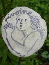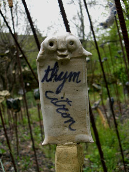 Étiquettes de plantes en grès émaillé blanc, décor et inscription à l’oxyde de cobalt, fichées sur tiges de fer à béton.