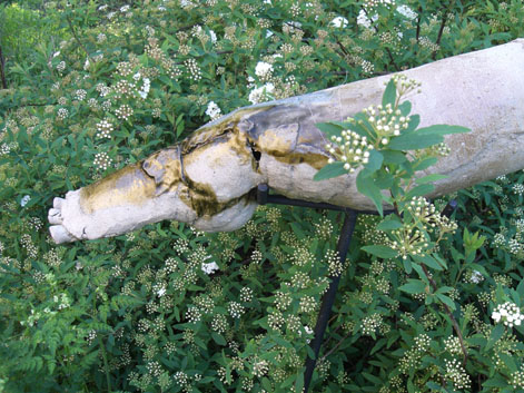 Des têtes et des membres sont présentés sur des supports métalliques; ils poussent dans le jardin comme fleurs sur tiges parmi des plantes: glycines, rosiers, seringats, clématites, asters ou pervenches…